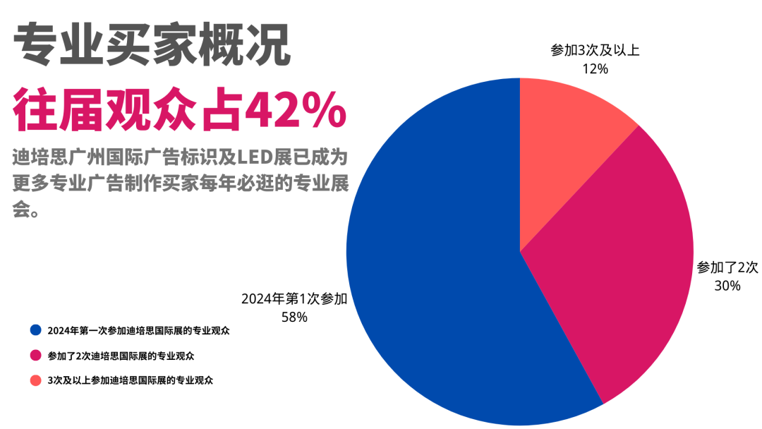 數(shù)據(jù)顯示,參加迪培思國(guó)際宣傳展2次以及2次以上的觀眾高達(dá)42%,越來(lái)越多的專(zhuān)業(yè)買(mǎi)家選取連續(xù)每年參加迪培思廣州國(guó)際宣傳標(biāo)識(shí)及LED展認(rèn)識(shí)宣傳制作行業(yè)的最新趨勢(shì),況且到場(chǎng)的買(mǎi)家中,都數(shù)是企業(yè)高管或項(xiàng)目負(fù)責(zé)人,大部分都持有絕對(duì)或部分采購(gòu)和決策權(quán),足見(jiàn)迪培思展會(huì)的行業(yè)影響力之高。