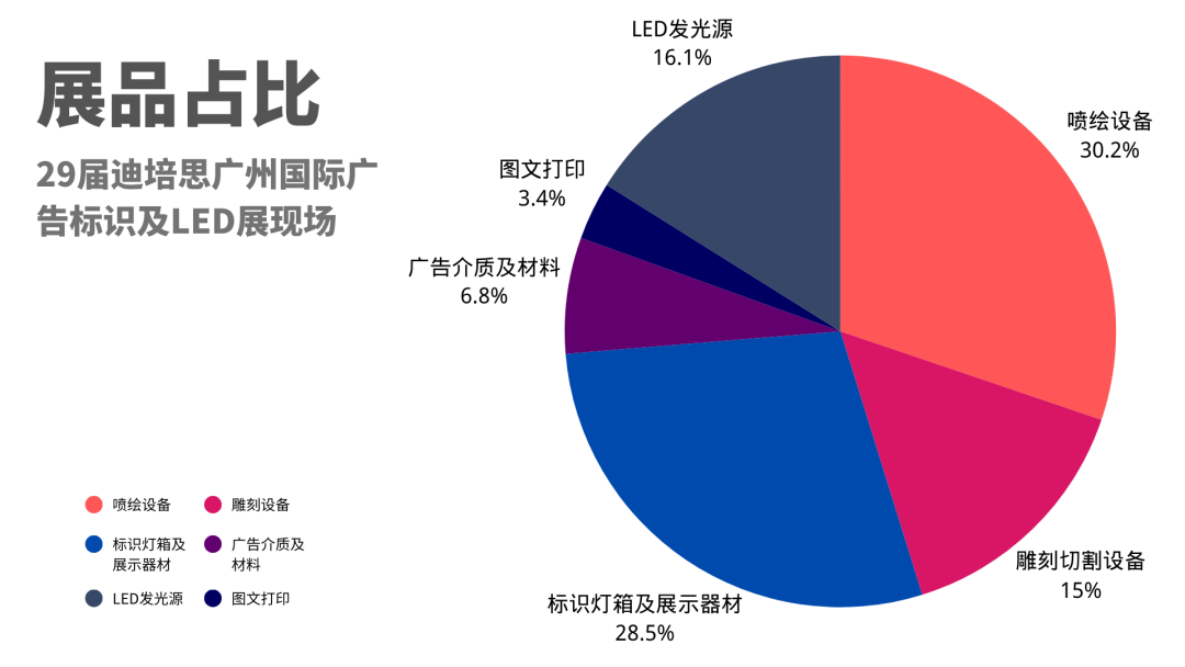 本屆展會(huì)戶(hù)內(nèi)外數(shù)碼噴繪、寫(xiě)真設(shè)備等噴繪設(shè)備占比達(dá)30.2%;標(biāo)識(shí)制品、展覽展示制品占比達(dá)28.5%;雕刻機(jī)、激光機(jī)、彎字機(jī)等占比達(dá)15%;LED發(fā)光源制品占比為16.1%;廣告介質(zhì)及材料占比為6.8%,新增的圖文打印設(shè)備占比為3.4%。
