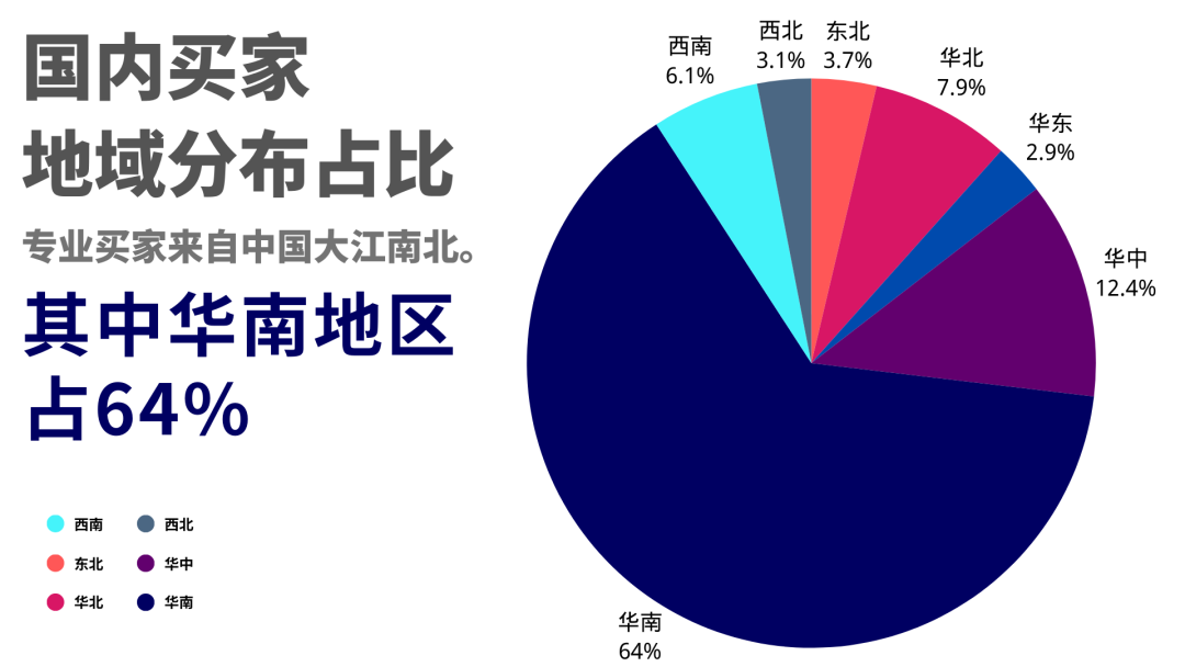國(guó)內(nèi)觀眾重點(diǎn)來(lái)自華南地區(qū),占比64.0%。展會(huì)專(zhuān)業(yè)買(mǎi)家觀眾來(lái)自全國(guó)的34個(gè)省市自治區(qū),覆蓋面較廣,省外買(mǎi)家的比例亦在逐年上升。