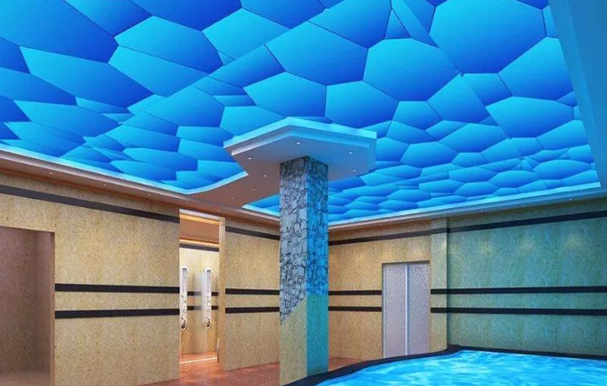 01室內軟膜軟膜采用特殊的聚氯乙烯材料制成,0.18-0.2mm,每平方米重約180~320克,其防火級別為B1級。軟膜需要在實地測繪出天花尺寸后,在工廠里制作完成,軟膜尺寸的穩定性在攝氏-15度到45 度。