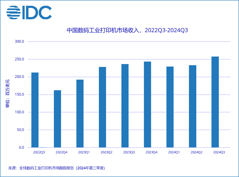 按照國際數據機構(IDC)發布的《全世界工業打印機市場跟蹤報告(2024年第三季度)》,2024年第三季度中國數碼工業打印機市場收入突破2.6億美金,同比增長8.8%。這一增長重點得益于數碼紡織印花機和數碼工業包裝及標簽印刷機的強勁表現,分別同比增長20.0%和17.0%,盡管大幅面數碼印刷機市場收入同比下滑5.0%。在大幅面數碼印刷機行業,市場需要不振,競爭加劇。工程繪圖機和數碼寫真宣傳噴繪機市場收入均呈現下滑態勢,部分原由是房地產行業發展低迷以及婚紗攝影和寫真拍攝消費需要的減少。與此同期,數碼紡織印花機市場連續增長,得益于國際賽事活動的積極影響以及旅游出行需要的增長,推動了紡織印花制品生產和加工的回流。