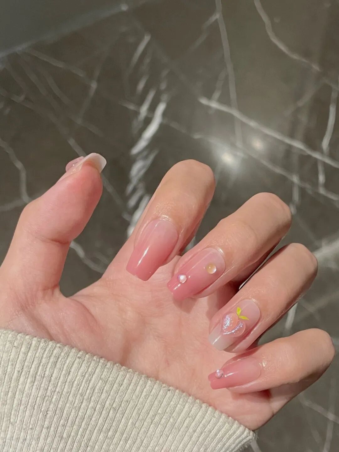 “蜜桃幻夢(mèng)”我個(gè)人超級(jí)愛好,甲片挺薄的,貼近自然本甲質(zhì)感,這款是清透的漸變?nèi)t粉,上面點(diǎn)綴了立體的桃子和小圓球,在陽光下看會(huì)有自然的光暈,閃但不夸張。屬于可甜可辣的,很適合穿小裙子的時(shí)候戴,戴完能維持十幾天都不會(huì)掉~